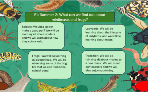 We will be learning all about minibeasts and other creatures that we can find. The children will have the opportunity to observe, discuss and question the different kinds of creatures that we can find. In particular, we will be learning about spiders, ladybirds and frogs. We will enjoy sports day and we will also be doing some work around transition to ensure that the children feel happy and safe in their new class.